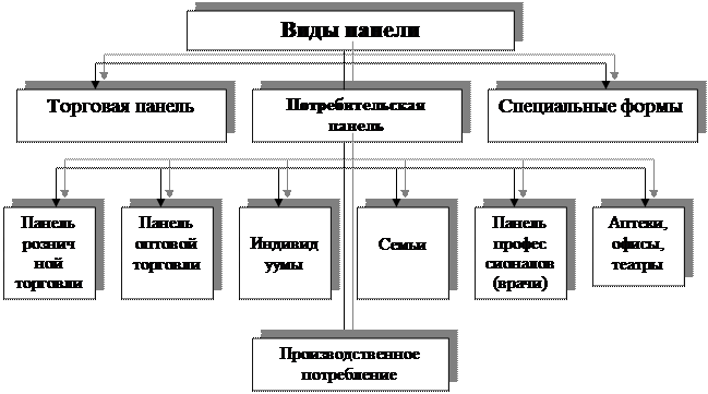 · постоянная (с определенными оговорками) совокупность объектов исследования—домашние хозяйства, предприятия торговли, производственные потребители. На практике образовался с течением времени целый ряд различных видов панели.
