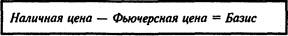 Разница между наличными и фьючерсными ценами и привела в биржевой практике к появлению понятия "базис"— разницы между ценой товара на наличном рынке в конкретном месте и ценой аналогичного товара на фьючерсном рынке. Базис рассчитывается путем вычитания цены на фьючерсном рынке из наличной цены, при этом обычно имеется в виду ближайший фьючерсный месяц: