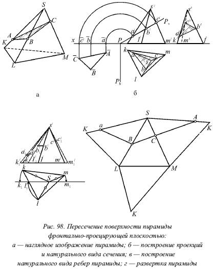 На рисунке 98 показано пересечение поверхности пирамиды фронтально-проектирующей плоскостью Р. На рисунке 98б изображена фронтальная проекция а точки встречи ребра KS с плоскостью P. Она определяется пересечением следа P v с фронтальной проекцией ребра ḱś (рис. 98 а). Если фронтальная проекция а́ точки А дана, то легко найти её горизонтальную проекцию а.