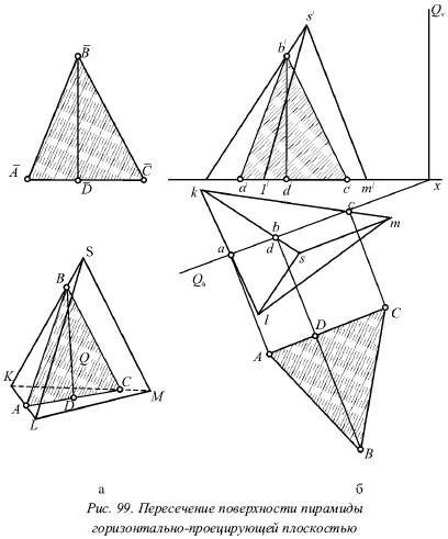 На рисунке 99 показано пересечение поверхности пирамиды горизонтально-проецирующей плоскостью Q. Треугольник ABC является сечением поверхности пирамиды плоскостью Q, основание АС которого проецируется на горизонтальную плоскость без искажения, а высота BD – на фронтальную и профильную плоскости.