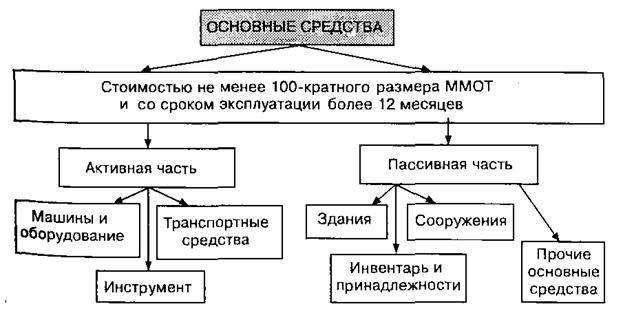 Основные средства — часть имущества, используемая в качестве средств труда при производстве продукции (выполнении работ, оказании услуг) либо для управленческих нужд фирмы в течение периода, превышающего 12 месяцев или обычный операционный цикл, и стоимостью более 100-кратного размера минимальной месячной оплаты труда (ММОТ).