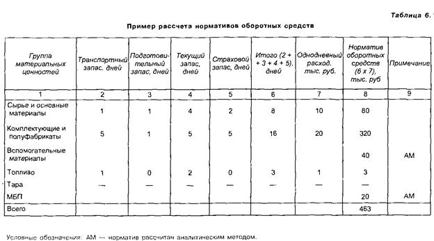 Норматив оборотных средств по производственным запасам рассчитывается исходя из описанных выше норм и однодневного расчета, как сумма всех входящих элементов. При этом надо иметь ввиду что как правило, норматив оборотных средств по МБП и вспомогательным материалам рассчитывается аналитическим методом. При использовании этого метода вначале исчисляется норма оборотных средств в рублях на одного работника или на 1000 руб. стоимости всей продукции исходя из фактического потребления в базовом периоде. Затем полученный показатель умножается на планируемую численность персонала или выпуск продукции. Условный пример расчета нормативов оборотных средств при веден в таблице 6.1