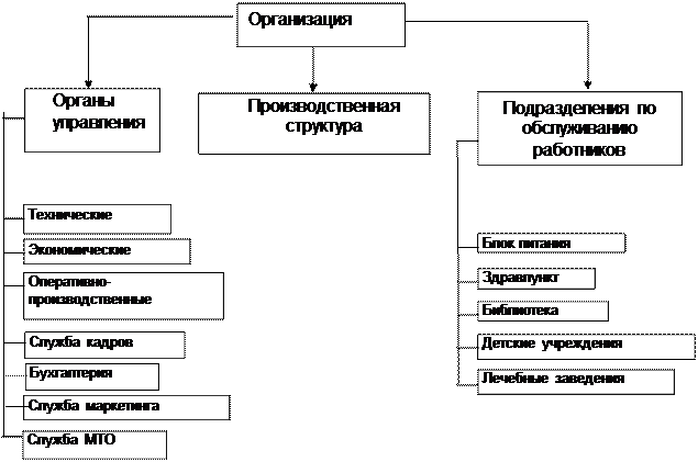 В зависимости от выпускаемой продукции и методов её обработки в организации создаются соответствующие подразделения. Каждая организация состоит из цехов, участков, хозяйств, органов управления и организаций по обслуживанию работников предприятия. Различаютобщую и производственнуюструктуру организации.