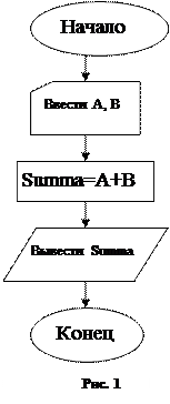 Например, алгоритм решения задачи вычисления суммы двух целых чисел на языке блок-схем будет записан, как показано на рис. 1.