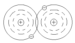 Рис. 1.2. Схематическое изображение двухатомной молекулы с ковалентной связью Если рассмотреть модели атомов (Рис. 1.2), то можно увидеть, что валентный электрон первого атома взаимодействует (притягивается) с положительным ядром второго атома, а электрон второго атома - с ядром первого атома. Это взаимодействие кулоновское, т.е. электрическое. Или иначе, электрон первого ядра находится некоторое время у второго ядра и наоборот. Примерами ковалентных связей могут служить молекулы H2, O2, СО, С2. Ковалентная связь существует не только у газов, например, алмаз представляет соединение атомов углерода (-С-С-), карборунд - углерода и кремния (-Si-С-). Если атом отдает с внешней орбиты электрон, то он превращается в положительный ион. И наоборот, если атом присоединяет лишний электрон, он превращается в отрицательный ион. Ионная связь образована силами притяжения между положительным и отрицательным ионами. При этом общая сумма положительных и отрицательных зарядов ионов в молекуле равна нулю. Силы, обеспечивающие притяжение атомов в ионных молекулах, имеют в основном электрическую природу. Эта связь характерна для соединений неметаллов с металлами, например, ионов натрия Na+ и ионов хлора Сl- или КJ, Аl2О3 и т.д. Ионная связь может существовать лишь для атомов различных химических элементов, так ионы хлора Cl- и Cl- не могут электрически притягиваться. Молекулы бывают нейтpaльные и полярные (дипольные). Если центры тяжести положительных и отрицательных зарядов в молекуле совпадают, молекулу называет нейтральной. У полярных молекул эти центры не совпадают и образуют диполь (Рис. 1.3).