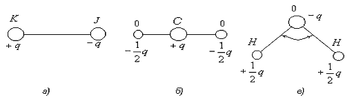 Рис. 1.4. Схема пространственного строения молекулы а) йодистого калия KJ, б) углекислого газа CO2, в) воды H2O По написанию химической формулы нельзя определить полярные молекулы, у данного вещества или нейтральные. Так, формулы углекислого газа (СО2) и воды (Н2О) в записях похожи, но углекислый газ имеет симметричное строение молекул (Рис. 1.4, б) с m = 0, а вода - несимметричное с m =6,1×10-30 Кл×м (Рис. 1.4, в). В результате молекулы углекислого газа нейтральны, а вода имеет резко выраженные полярные свойства. Диэлектрики, состоящие из нейтральных молекул с m = 0, называют неполярными, a диэлектрики, состоящие из дипольных молекул с m > 0, - полярными диэлектриками. Третий вид связи в веществе -