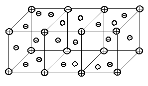 Рис. 1.5. Схема строения металлического проводника. Наличие "свободных" электронов приводит к высокой электропроводности металлов. В общем можно сказать, что существует очевидная связь между типом связей атомов в молекулах и свойствами материалов. Существовало представление, что молекулы являются очень малыми частицами. Это не всегда правильно, так как размеры молекул различных материалов различаются на много порядков. Некоторые молекулы действительно очень малы и их размеры сравнимы с размерами атомов. Например, размер молекулы воды имеет порядок 2,7×10-10 м. Но многие молекулы имеют макроскопические размеры. Кристаллы и