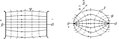 Рис. 2.1. Простейшие картины электрического поля Силовые линии при этом проводятся нормально к поверхностям равного потенциала называемым, эквипотенциальными Обычно силовые линии рисуются так, чтобы число силовых линий на единицу площади эквипотенциальной поверхности было в среднем равно