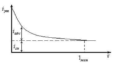 Рис. 3.1. Зависимость тока утечки через диэлектрик от времени Если хотят определить сопротивление диэлектрика (изоляции), то токи абсорбции не учитывают и тогда