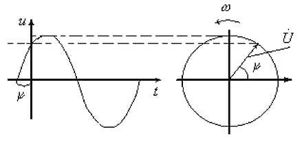 Рис. 4.1. Пример векторного представления синусоидально изменяющегося напряжения Такое представление позволяет получать результаты сложения и вычитания синусоидальных величин в гораздо более простом виде сложения и вычитания соответствующих векторных величин на векторной диаграмме.