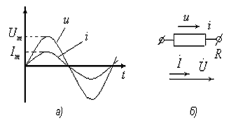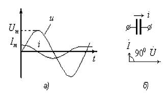Из (4.1) следует, что ток, протекающий через активное сопротивление, совпадает по фазе с приложенным напряжением (Рис. 4.2, а). При этом векторы тока и напряжения, показанные на векторной диаграмме (Рис. 4.2, б), будут совпадать по направлению. Если приложить синусоидальное напряжение u=Um·sinωt к конденсатору, то по синусоидальному закону будет меняться и заряд конденсатора q = Cu = C Um·sinωt.