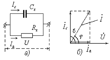 Из (4.2) видно, что ток через конденсатор по фазе опережает положенное напряжение на 90° (Рис. 4.3, а). Поэтому и на векторной диаграмме (Рис. 4.3, б) вектор тока, протекающего через конденсатор, опережает приложенное напряжение на 90о. Через реальный диэлектрик с диэлектрическими потерями, при воздействии переменного напряжения протекает ток I, имеющий две составляющие: активную Iа и реактивную (емкостную) I с.