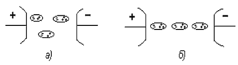 Чаще всего в жидких диэлектриках в качестве примесей встречается вода. Под влиянием электрического поля капли влаги поляризуются и превращаются в диполи. Противоположные по знаку заряды, находящиеся в этих диполях, взаимодействуют с приложенным полем и растягивают капли, превращая их в удлиненные эллипсоиды (Рис. 5.7, а). Разноименно заряженные концы эллипсоидов, притягиваясь друг к другу, образуют между электродами так называемые мостики из примесей (Рис. 5.7, б). Поскольку вода обладает повышенной проводимостью, по мостикам проходит ток, разогревающий воду до температуры кипения. В результате вскипания воды между электродами образуется газовый канал, в котором начинается ударная ионизация электронами и происходит пробой, аналогичный пробою в газовых промежутках.