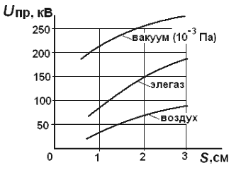 В соответствие с законом Пашена, электрическая прочность воздуха при очень низких давлениях существенно возрастает. Поэтому, вакуум является хорошим электроизоляционным материалом (Рис.2.2). Однако, из-за высокой стоимости вакуумной изоляции, область применения в энергетике, ограничивается лишь использованием вакуума в высоковольтных выключателях с номинальными напряжениями 0,4 - 110 кВ. Вакуумные выключатели имеют малые размеры, большой ресурс работы и высокое быстродействие.
