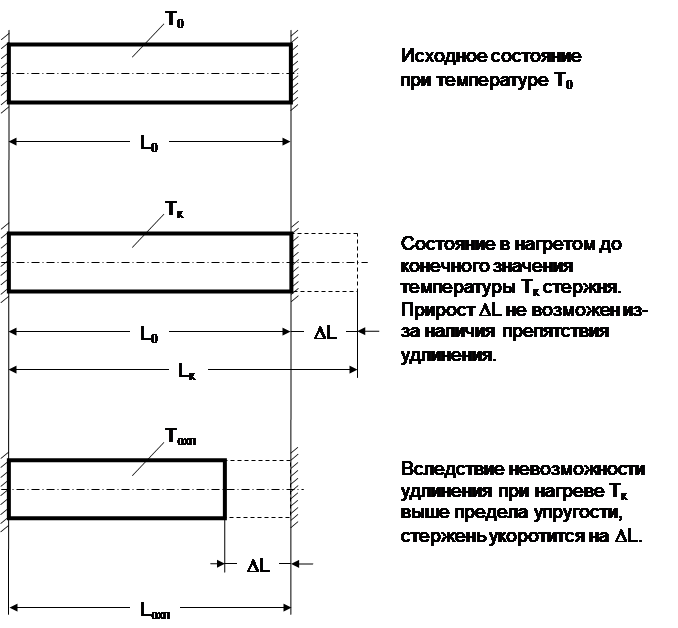 Если же стержень нагревать до температуры, при которой металл теряет упругие свойства, и величина относительного сжатия e будет настолько велика, что вызванные этим сжатием напряжения: s= Е. e, превысят предел упругости ss, то в стержне возникнут остаточные деформации сжатия. Если после нагрева стержень освободить от действия устройств защемления и предоставить стержню свободно остывать, то после достижения исходной температуры, стержень окажется укороченным на величину обжатия, вызванного принудительным защемлением.