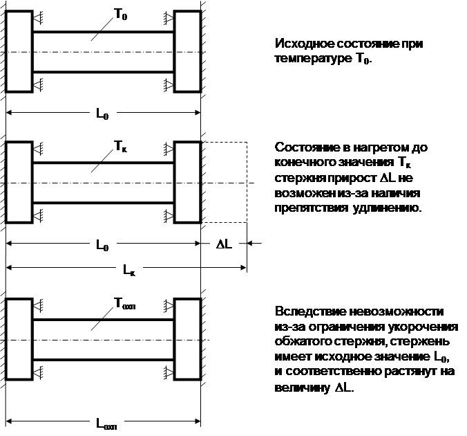 Одним из параметров, характеризующих поведение металлов, это их способность при нагревании увеличивать свои линейные размеры. С целью некоторого упрощения исследования процесса рассмотрим нагрев стержня защемлённого с обоих концов.