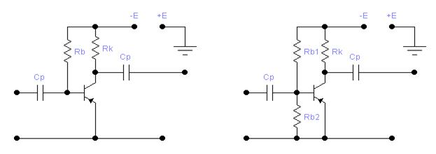 Напруга зміщення UБЕ забезпечується з допомогою дільника напруги RБ1 і RБ2 в колі бази.