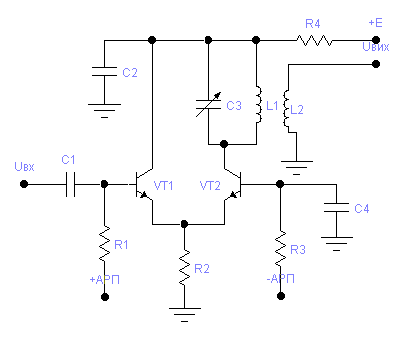 Такі підсилювачі мають більш лінійну ВАХ, що робить їх вигідними для використання на вході супергетеродинних приймачів. Завдяки диференційному включенню транзисторів каскад має хороші регулювальні характеристики. Напругу АРП можна подавати як в додатній полярності на базу VT1 так і у від’ємній на базу VT2, або у відповідній полярності на бази двох транзисторів.