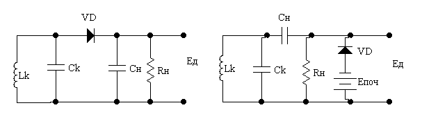 На вході АД діє гармонічна напруга з повільно-змінною амплітудою Uвх = Uсcoswсt. Якщо Uвх додатне то діод відкривається і конденсатор Сн починає заряджатися. Постійна часу заряду tз конденсатора визначається ємністю Сн і малим опором відкритого діода. По мірі заряду Сн вихідна напруга Ед росте і старається закрити діод, бо Uд = Uвх - Ед і в момент t = t1 Uвх = Ед, при цьому Uд = 0. Починаючи з t1 діод закривається (Uвх < Ед) і конденсатор Сн починає розряджатися через Rн. Постійна часу розряду конденсатора tр = Rн Сн >> tз, тому розряд Сн проходить значно повільніше ніж його заряд. Розряд продовжується до моменту часу t = t2, при якому напруга Uд стає рівна нулю.