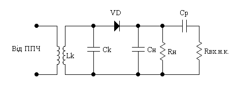 ЧД| з|із| одиночним контуром. Перетворення ЧМ-коливання в детекторі, схема якого показана на рис.23.4 здійснюється в резонансному LC-контурі, використовуючи для цього похилу ділянку його АЧХ|,де залежність UKвід f близька до лінійної. Таким чином дія даного виду ЧД| відбувається|походить| із|із| розстроєним відносно| частоти сигналу контуром. При використанні похилої ділянки АЧХ| контуру виникає супутня модуляція, при якій закон зміни амплітуди UKнапруги|напруження| на контурі відповідає закону зміни частоти вхідного сигналу. Напруга|напруження| з контуру подається на амплітудний детектор.