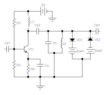 Принцип роботи: поки напруга на контурі Uк < Ед, діод закритий і не впливає на контур. В цьому випадку схема працює як звичайний підсилювач і Uк = К0 Uвх. Якщо Uк > Ед, то діод відкривається, його вхідний опір починає шунтувати контур, затухання контуру збільшується, еквівалентний опір контура при резонансі зменшується, значить, зменшується коефіцієнт підсилення, що забезпечує приблизно постійну на пругу на виході АО.
