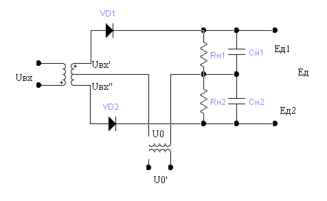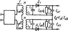 Балансний ФД. Такий ФД представляє собою два діод них однотактних ФД, кожний із яких працює на своє навантаження. В результаті цього на виході кожного плеча ФД створюється напруга Ед1 і Ед2 зустрічної полярності, тому Ед = Ед1 - Ед2. Вхідна напруга підводиться до діодів в протилежній полярності. Опорна напруга прикладається до діодів в однаковій фазі (Рис. 22.3).