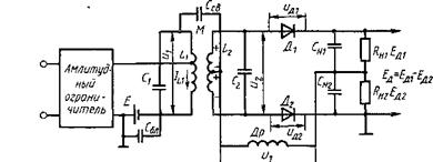Дробовий ЧД|. Характерною|вдача| особливістю дробового ЧД| є|з'являється,являється| мала чутливість до амплітудної модуляції напруги|напруження|, що детектується, дякуючи чому відпадає необхідність в АО. Схема дробового ЧД| (рис.23.7.) є|з'являється,являється| варіантом схеми ЧД| із|із| зв'язаними контурами; її відмінність|відзнака| полягає в способі включення|приєднання| діодів і навантаження, а також у введенні котушки|катушки| зв'язку L3 замість дроселя Др. У дробовому ЧД| полярність діода Д2змінена на зворотну; при цьому напруга|напруження| ЕД = ЕД1 + ЕД2. Ця напруга|напруження| підводиться до конденсатора С0 настільки великої ємності|ємкості|, що напруга|напруження| на ньому не встигає|устигає| реагувати на швидкі зміни амплітуди вхідного сигналу. Отже, в процесі роботи ЧД| може мінятися тільки|лише| відношення|ставлення| ЕД1/ ЕД2 а не їх сума. Саме з цієї причини ЧД| рис.23.7 називають дробовим (іноді|інколи| детектором відношення|ставлення|).