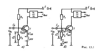 Регулююча напруга|напруження| Uрег подається в коло|цеп| емітера або в коло|цеп| бази транзистора. Схема регулювання першого виду|виду| показана на рис. 25.1,а, напруга|напруження| зміщення|зміщення| на транзисторі Uбе0 = Uo — Eрег. У міру збільшення Ерег напруга|напруження| Uбе0зменшується, що спричиняє за собою зменшення струму|току| Іко і к рутизни|крутість| S,внаслідок чого коефіцієнт підсилення К0 знижується. Коло|цеп| регулювання повинно забезпечити струм|тік|, приблизно рівний Іе0. Якщо регулюється п каскадів, то струм|тік| регулювання Ірег≈І е0, томуколо|цеп| регулювання повинно виробляти порівняно великий струм|тік| Ірег, що є|з'являється,являється| недоліком|нестачею| схеми рис. 25.1,а. Від цього недоліку|нестачі| вільні кола|цепи| регулювання другого типу, в яких напруга|напруження| Ерег вводиться|запроваджується| в коло|цеп| бази (рис. 25.1,б). Згідно рис. 25.1,б(Uбео = U0 — Ерег тому принцип регулювання вобох випадках однаковий. Перевага регулювання по схемі рис. 25.1,6 полягає в тому, що струм|тік| Ірег рівний струму|току| дільника Ідл = (5 — 10)ІБ0, у багато разів менший струму|тік| Ірег при регулюванні по схемі рис. 25.1,а.Проте |однак| схема рис. 25.1,6 менш стабільна в роботі, оскільки в ній відсутній резистор в колі|цепі| емітера Rе. Включення |приєднання| резистора Rе приводить|призводить,наводить| до зменшення ефективності регулювання, оскільки|тому що| він забезпечує стабілізацію режиму не тільки|не лише| при зміні температури, але і при зміні Ерег. При включенні|приєднанні| резистора Rедлязабезпечення тієї ж глибини регулювання необхідно подавати більше значення напруги|напруження| Ерег.