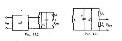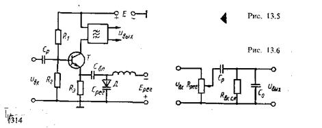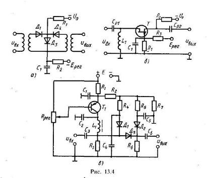 Регулювання зміною Rекв. Таке регулювання може здійснюватися різними способами. На рис. 25.2 показана схема регулювання з|із| підключеним паралельно контуру діодом Д. ПриЕрег > UK діод закритий|зачинений| і контур практично не шунтує; при цьому Rекві К0 найбільші. При Ерег < UK діод відкривається|відчиняється| і його вхідний опір шунтує контур. В цьому випадку Rекв , а отже, і К0 зменшуються.Основний недолік|нестача| такого способу регулювання полягає в тому, що при зміні Rекв міняєтьсяне тільки|не лише| К0, але іеквівалентне затухання|затухання| контуру, а це викликає|спричиняє| зміну смуги пропускання підсилювача. Проте|тим не менше| при сильному сигналі допустимо деяке погіршення селективності.