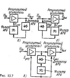 Принцип дії і види АРП Автоматичне регулювання підсилення (АРП) призначене для підтримки постійної напруги|напруження| на виході ППЧ|, необхідної для нормальної роботи вихідних пристроїв|устроїв| приймача. Рівень сигналу на вході приймача змінюється звичайно в дуже широких межах; при максимальній напрузі|напруженні| на вході РПП| система АРП повинна забезпечити мінімальний коефіцієнт підсилення радіотракту приймача і навпаки. Таким чином, завдання|задача| АРП — змінювати|зраджувати| підсилення радіотракту РПП| залежно від рівня вхідного сигналу. Система АРП повинна мати пристрій|устрій|, напруга|напруження| Ерег на виході якого залежить від рівня сигналу в радіотракті приймача. Таким пристроєм|устроєм| може служити, наприклад, амплітудний детектор. Напруга|напруження| Ерег, що подається на підсилювальні каскади, змінює|зраджує| їх коефіцієнт підсилення. Для АРП в приймачі створюється коло|цеп| АРП, що складається з детектора АРП і фільтру. Залежно від способу подачі регульованої напруги|напруження| АРП підрозділяються на зворотні, прямі і комбіновані.