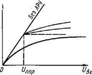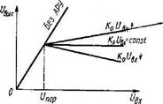 цього не вимагається. Для усунення цього недоліку|нестачі| використовують АРП із затримкою, вякій коло|цеп| АРП починає|розпочинає,зачинає| діяти тільки|лише| у тому випадку, коли вхідна напруга|напруження| Uвх перевищує порогову Uпор; при цьому слабкі|слабі| сигнали колом|цепом| АРП не ослабляються (рис. 26.2). При ідеальній роботі кола|цепу| АРП із затримкою для UBX ≥Unop напруга|напруження| на виході підсилювача постійна (пунктирна пряма на рис. 26.2). У міру збільшення коефіцієнта підсилення підсилювача в колі|цепі| АРП характеристика АРП реального підсилювача все більшою мірою наближається до ідеальної. Особливістю зворотної АРП є|з'являється,являється| те, що вона не дозволяє одержати|отримати| ідеальну характеристику АРП; в цьому випадку можна лише наблизитися до неї. Зворотна АРП не може бути ідеальною, оскільки для її роботи принципово необхідний приріст вихідної напруги|напруження| ΔUвих.Якщо допустити, що АРП ідеальна, то ΔUвих = 0. При цьому Ерег = const, К0 = const, регулювання відсутнє, а отже, Uвих повиннезростати.