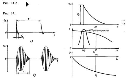 Під дією імпульсної завади в приймачі виникає перехідний процес. Заваду можна розглядати|розглядувати| як ударну дію (рис. 29.1, а), а радіотракт приймача — як коливальну систему, на виході якої під дією завади з'являється|появляється| високочастотний імпульс (рис. 29.1,6) тривалістю τ, де τ — постійна часу радіотракту приймача. Якщо перехідні процеси на виході радіотракту при дії імпульсів завад перекриваються, то завади вже не можна вважати|лічити| імпульсними. Імпульсна завада може мати будь-яку форму. При дослідженні часто вибирають імпульсну заваду (рис. 29.2, а) виду еА| =Uвх = Uoe-at, де| а -коефіцієнт, що характеризує швидкість спаду напруги|напруження| завади. Спектральна щільність імпульсної завади згідно перетворенню Фур’є
