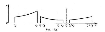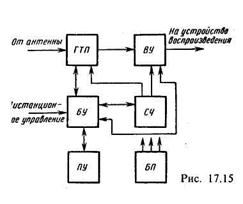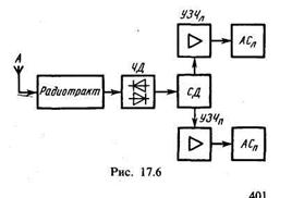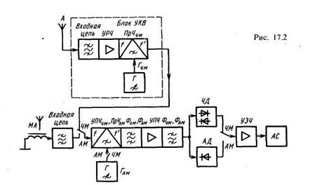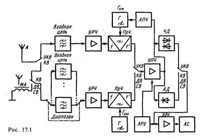 Структурна схема приймача, широко вживана на практиці, показана на рис. 17.2. При прийомі АМ|-сигналів перетворення частоти здійснюється в ПРЧАМ|, навантаженням якого є|з'являється,являється| фільтр ФАМ| на проміжній частоті 0,465 Мгц. При прийомі ЧМ-сигналів перетворювач частоти ПРЧАМ| використовується як додатковий ППЧ| на частоті 10,7 Мгц, навантаженням якого є|з'являється,являється| фільтр Фчм; перетворення частоти ЧМ-сигналу, що приймається, здійснюється в перетворювачі ПрЧчм блоку УКХ|. Цей блок включає вхідне коло|цеп|, ПРЧ| і перетворювач частоти ПрЧчм з|із| гетеродином Гчм.