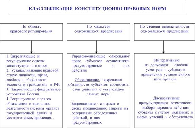 Классификация конституционно-правовых норм имеет значение для выявления специфических свойств и особенностей норм и, следовательно, для повышения эффективности их применения. Классификация конституционно-правовых норм строится на нескольких основаниях.