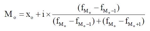 где Хо - нижняя граница модального интервала (модальным называется интервал, имеющий наибольшую частоту); i - величина модального интервала; f Мо - частота модального интервала; f Мо-1 - частота интервала, предшествующего модальному; f Мо+1 - частота интервала, следующего за модальным.