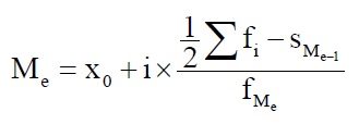 Хо - нижняя граница медианного интервала (медианным называется первый интервал, накопленная частота которого превышает половину общей суммы частот); i - величина медианного интервала; Sme-1 - накопленная частота интервала, предшествующего медианному; f Me - частота медианного интервала.