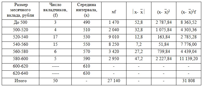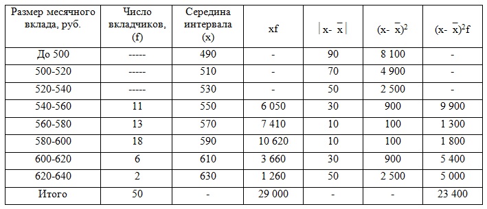 1) Составим расчетную таблицу для банка с рекламой. Для определения среднего размера вклада за месяц найдем середины интервалов. При этом величина открытого интервала (первого) условно приравнивается к величине интервала, примыкающего к нему (второго).