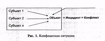Конфликту предшествует возникновение конфликтной ситуации. Это противоречия, возникающие между субъектами по поводу объекта (рис. 1).