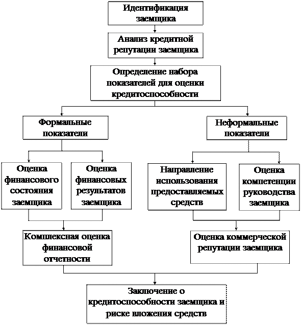 На первом этапе, независимо от характера предстоящей кредитной сделки, заемщик идентифицируется. Идентификация позволяет четко определить характер деятельности заемщика (коммерческая фирма, банк, частное лицо) и наметить примерный набор показателей для оценки инвестиционной привлекательности.
