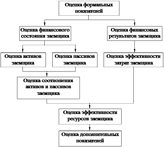 Формальные показатели – получившие такое название из-за того, что они могут быть рассчитаны по определенным формулам, и имеющие числовое значение – рассчитываются на основании данных финансовой отчетности заемщика – юридического лица. Для расчета формальных показателей заемщика – физического лица исходными являются данные о финансовых операциях заемщика. Неформальные показатели могут быть оценены только экспертами, они не имеют формул для расчета и четкого набора исходных данных. Комплексная оценка финансовой отчетности представляет собой структурный анализ деятельности заемщика. Оценка коммерческой репутации – это комплексное экспертное заключение, которое является своего рода рекомендацией о продолжении сотрудничества с заемщиком.