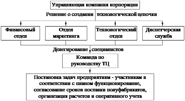 Процесс организации ТЦ (рис. 28), как неотъемлемый этап цикла управления, направлен на повышение эффективности функционирования создаваемой ТЦ, поэтому в процессе управления взаимодействуют специалисты различных служб, что полностью соответствует концепции горизонтальной корпорации. Таким образом, на этапе организации создаются предпосылки для успешного освоения технологии и функционирования производственного процесса в рамках технологической цепочки с минимальным риском.