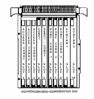 В таблице 4.3 перечислены блоки, используемые в оборудовании, а также указаны сведения о позиции каждого из элементов (номер Slot) и о возможном максимальном количестве данных плат в оборудовании. В таблице 4.3 указывается также «акроним», идентифицирующий блоки и представляющий собой надпись на передней панели.
