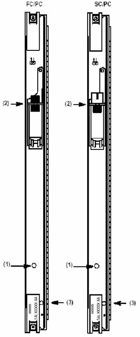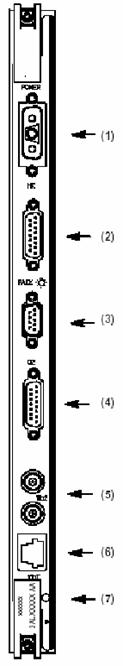 | (1) Кнопка перезапуска лазера; (2) Канал 1; (3) ДСД | (1) Питание; (2) Удаленный и служебный аварийные сигналы; (3) Лампочка стойки; (4) QMD (Q2); (5) I/O BNC для интерфейса Q3 10Вase2; (6) RJ45 для интерфейса Q3 10ВaseT; (7) ДСД |