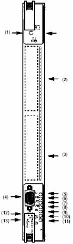 | (1) Питание; (2) Дополнительные каналы: 2 канала G.703, 2 канала RS-232, 2 канала V.11; (3) Дополнительные сигналы и сигналы синхронизации 2 Мбит/с: J1 – вход 2 МГц, J2 – вход 2 Мбит/с, J3 – выход 2 МГц, J4 – выход 2 Мбит/с; (4) Точка подключения телефона по четырехпроводной схеме (RJ11); (5) Z1–Z4 – светодиоды выбора зоны EOW (N.B.1); (6) L1–L2 – состояние светодиодов для селективных и групповых вызовов (N.B.2); (7) Телефонное гнездо; (8) Кнопка захвата линии; (9) Кнопка выбора зоны EOW; (10) Командная кнопка сброса; (11) ДСД | (1) Командная кнопка сброса; (2) Канал 1 – электрический или оптический модули; (3) Канал 2 – электрический или оптический модули; (4) Разъем для подключения персонального компьютера (F-интерфейс); (5) Красный светодиод – срочный аварийный сигнал (критический или значительный); (6) Красный светодиод – несрочный аварийный сигнал (несущественный); (7) Желтый светодиод – сохранение аварийного сигнала (дежурного); (8) Желтый светодиод – аварийное состояние; (9) Желтый светодиод – индикативный аварийный сигнал (предупреждение); (10) Зеленый светодиод: зажжен – активный блок погашен - резервный блок; (11) ДСД; (12) Кнопка тестирования ламп; (13) Кнопка сохранения аварийного сигнала (дежурного) |
