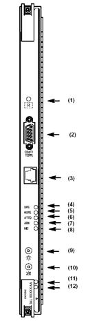 | (1) Командная кнопка перезапуска; (2) RJ45 используется только в заводских условиях; (3) МСД; | (1) Командная кнопка перезапуска; (2) Разъем для персонального компьютера (F-интерфейс); (3) RJ45 используется только в заводских условиях; (4) Красный светодиод – срочный аварийный сигнал; (5) Красный светодиод – несрочный аварийный сигнал (несущественный); (6) Желтый светодиод – сохранение аварийного сигнала (дежурная авария); (7) Желтый светодиод – ненормальное состояние; (8) Желтый светодиод – индикативный аварийный сигнал (предупреждение); (9) Кнопка тестирования лампочек; (10) Кнопка сохранения аварийного сигнала (дежурная авария); (11) Зеленый светодиод – если светодиод горит – блок активен; (12) ДСД |