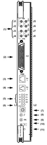 | (1) Дополнительные каналы I/O 2 Мбит/с G.703: (2) J1 – выход 1 2 Мбит/с; J2 – вход 1 2 Мбит/с; J5 – выход 2 2 Мбит/с; J6 – вход 2 2 Мбит/с; Синхронные интерфейсы I/O 2 МГц: J3 – выход 1 2 МГц; J4 – вход 1 2 МГц; J7 – выход 2 2 МГц; J8 – вход 2 2 МГц; (2) Дополнительные каналы: 4 канала RS-232; 4 канала V.11 64 Кбит/с; 4 канала G.703 64 Кбит/с; (3) Точка подключения телефона по четырехпроводной схеме (RJ45) (4) Точка подключения телефона по четырехпроводной схеме (RJ11) (5) Z1-Z8 - светодиоды выбора зоны EOW (N.B.1) (6) L1-L2 - состояние светодиодов для селективных и мультиселективных вызовов (7) Телефонное гнездо (8) Кнопка захвата линии (9) Кнопка выбора зоны EOW (10) Кнопка команды сброса (11) ДСД | (1) Канал 3 (N.B.) (2) Канал 4 (N.B.) (3) ДСД |