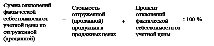 В конце месяца после определения фактической себестоимости выпущенной готовой продукции необходимо определить расчетным путем сумму отклонений фактической себестоимости от учетной цены по формуле: