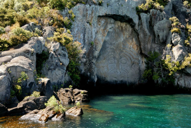 Однако в Новой Зеландии можно увидеть образцы не только деревянной, но и наскальной резьбы маори. Самое, пожалуй, известное в Новой Зеландии место, где туристы могут посмотреть наскальную резьбу – это Майн Бэй (Mine Bay) на озере Таупо (Taupo lake).