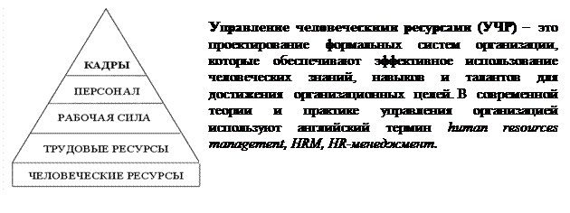 В настоящее время в России используются различные категории и понятия: «рабочая сила», «трудовые ресурсы», «трудовой потенциал», «кадры», «персонал», «человеческие ресурсы», социально-экономическое значение которых не учитывает тенденции развития науки и практики управления в условиях становления рыночной экономики. Возникновение любой новой категории – это реакция науки на потребности практики, теоретическое обобщение накопленного опыта.