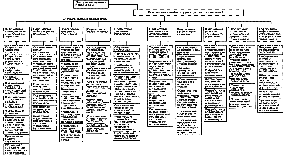 На рисунке 1 приведен состав функциональных подсистем системы УП организации, объединяющих однородные функции, носителями которых являются различные подразделения по работе с кадрами. В зависимости от размеров организаций состав подразделений меняется: в мелких организациях одно подразделение может выполнять функции нескольких подсистем, а в крупных – функции каждой подсистемы, как правило, выполняет отдельное подразделение.